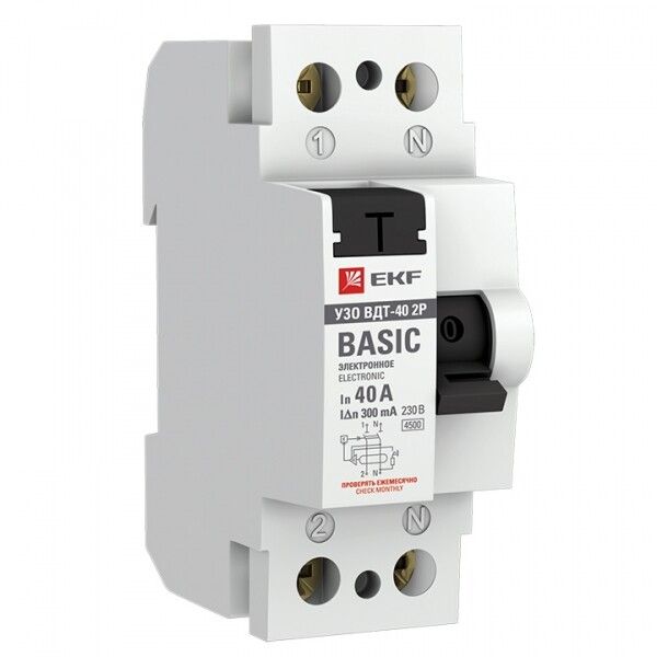 Выключатель дифференциального тока (УЗО) 2П 40А/300мА (электронное) ВД-40, ВДТ-40 от EKF предназначен для защиты людей от поражения электрическим током и предотвращения возгораний, вызванных утечками тока. Этот УЗО работает в паре с автоматическим выключателем и монтируется на DIN-рейку в распределительном щите. Артикул elcb-2-40-300e-sim соответствует серии Basic.
