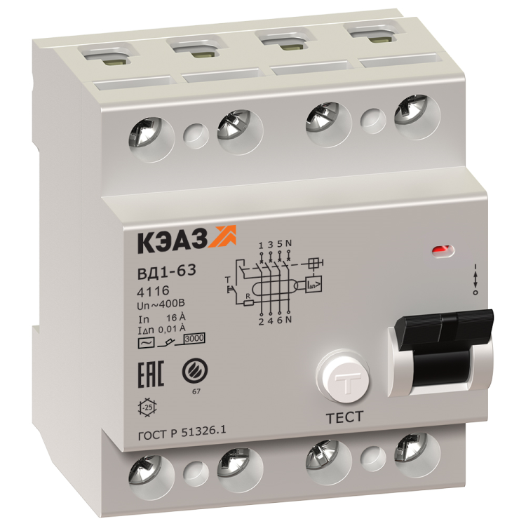 Выключатель дифференциального тока (УЗО) ВД1-63-4232-АС-УХЛ4 от КЭАЗ - четырёхполюсное устройство, предназначенное для защиты людей от поражения электрическим током за счёт отключения цепи при утечке тока 30 мА. Не имеет встроенной защиты от перегрузок и коротких замыканий, поэтому применяется совместно с автоматическими выключателями. Подходит для установки в распределительных щитах жилых, промышленных и коммерческих объектов.