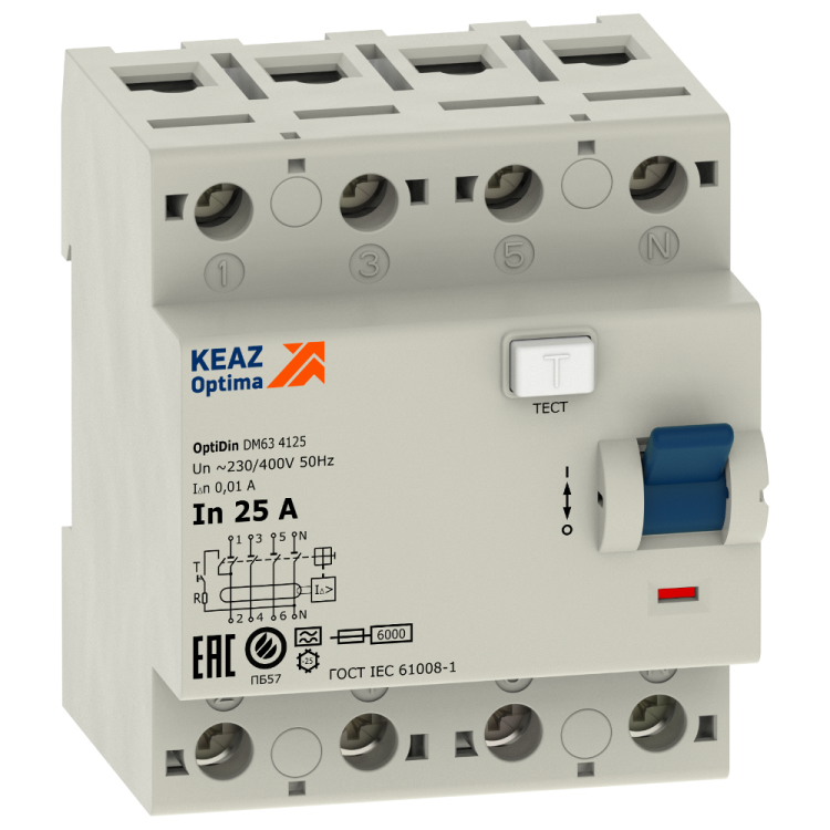 УЗО OptiDin DМ63-4340-A-УХЛ4 защищает от утечек тока в трёхфазных цепях с заземлением. Он срабатывает при дифференциальном токе 100 мА, предотвращая опасные ситуации - например, при повреждении изоляции, пробое корпуса оборудования или случайном контакте человека с токоведущими частями. Применяется в распределительных щитах промышленных установок: станков, конвейеров, насосных систем, тепловых пунктов, а также в объектах с высокой влажностью или изменяющимися нагрузками.