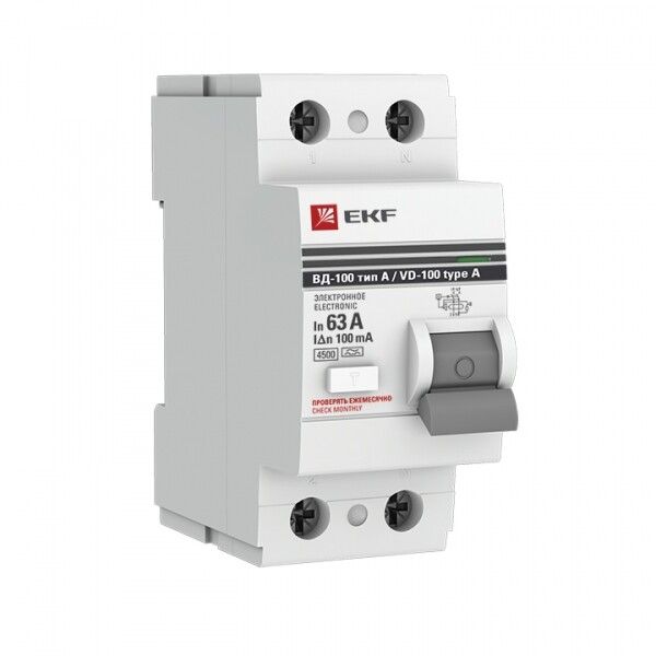 Выключатель дифференциальный (УЗО) ВД-100 2п 63А 100мА (тип А, электронный) PROximа | elcb-2-63-100-e-А-pro EKF (замена - E1026MA63100) elcb-2-63-100-e-a-pro