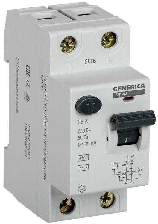 Выключатель дифференциального тока (УЗО) ВД1-63 2 полюса 25А 30мА тип AC от GENERICA - надёжное устройство для защиты людей от поражения электрическим током в бытовых и промышленных сетях переменного тока. Артикул mdv15-2-025-030 соответствует сериям ВД1-63 и совместим с популярными распределительными щитами.