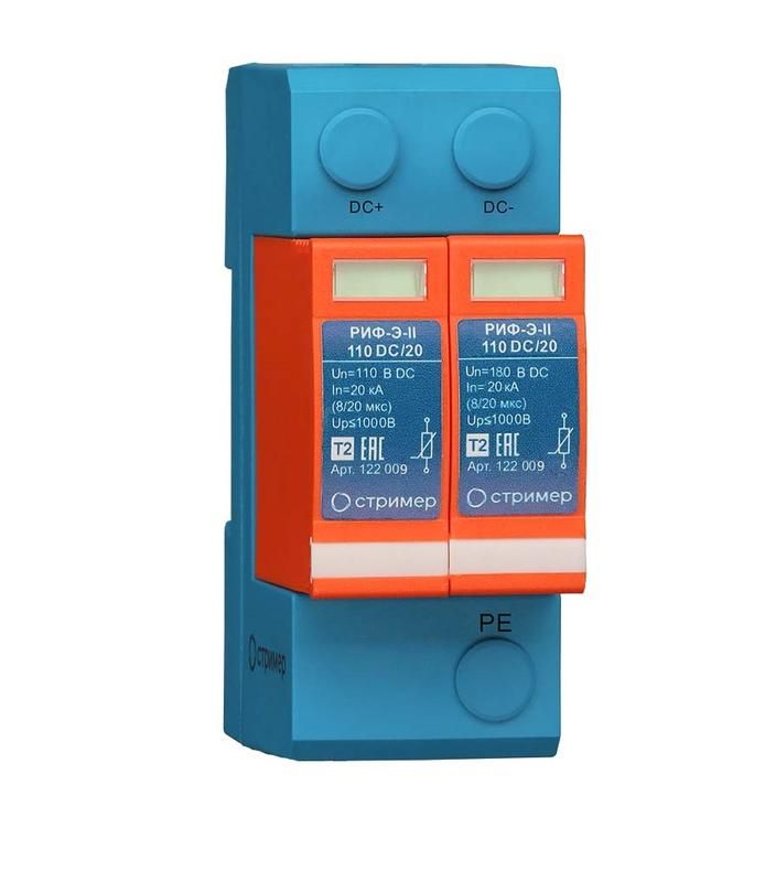 Устройство защиты от импульсных перенапряжений РИФ-Э-II 110DC/20 1кВ 20кА с визуальным сигналом Стример защищает двухпроводные цепи постоянного тока от высоковольтных импульсов. Применяется в системах с напряжением до 110 В постоянного тока, где есть риск возникновения перенапряжений - например, в солнечных электростанциях, железнодорожном транспорте, промышленных контроллерах, зарядных станциях и распределительных щитах постоянного тока.