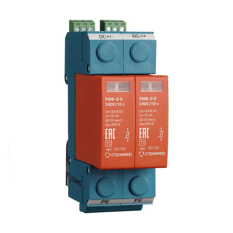 Устройство защиты от импульсных перенапряжений РИФ-Э-II 24DC/10кА с Стример - двухполюсное УЗИП класса II, предназначенное для защиты оборудования постоянного тока от импульсных скачков напряжения. Установлено на DIN-рейку, работает в широком диапазоне температур и применяется в системах управления, автоматизации и энергообеспечении. Артикулы 122107 и риф-э-ii 24=/10 с соответствуют одной модели из серии РИФ-Э.