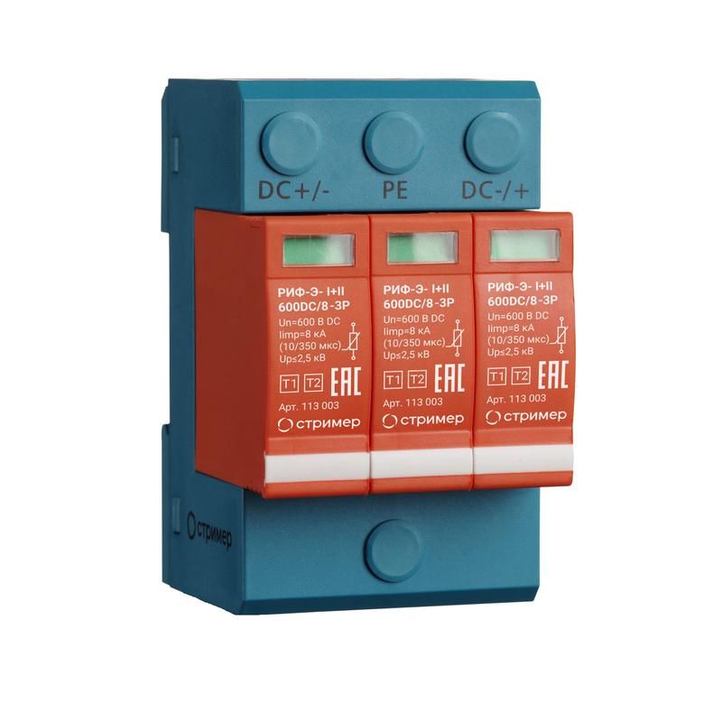 Устройство защиты от импульсных перенапряжений РИФ-Э-I+II 600DC/8-3P Стример - это трёхполюсное УЗИП класса I+II, предназначенное для защиты систем постоянного тока до 600 В от высоковольтных импульсов, таких как грозовые скачки или коммутационные перенапряжения. Благодаря визуальному индикатору и терморасцепителю, РИФ-Э-Strimer обеспечивает надёжную работу и легко контролируется в распределительных щитах. Артикул 113003 подходит для установки на DIN-рейку в промышленных и энергетических объектах.