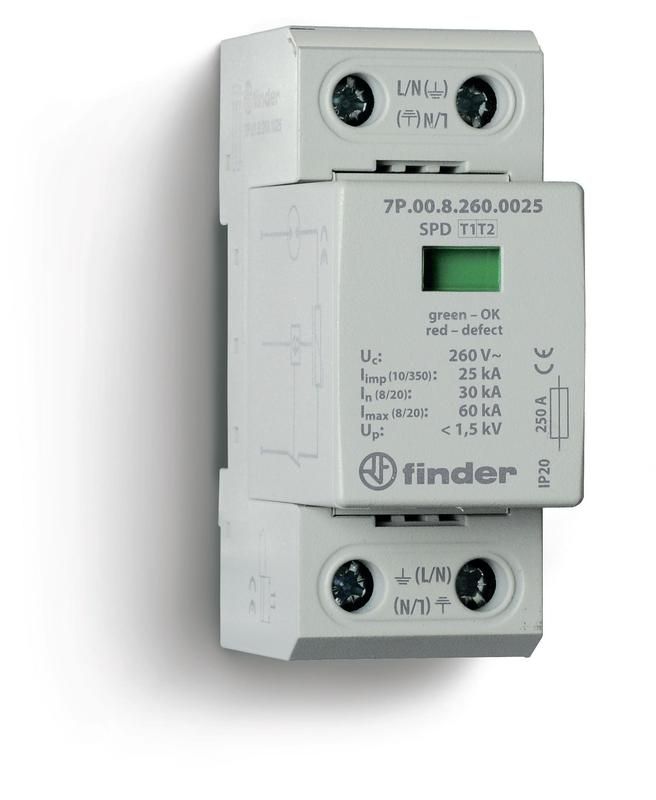 Устройство защиты от импульсных перенапряжений УЗИП тип 1+2 (1 варистор/искровый разрядник); модульный, ширина 36мм; степень IP20 FINDER 7P0182601025 7P.01.8.260.1025