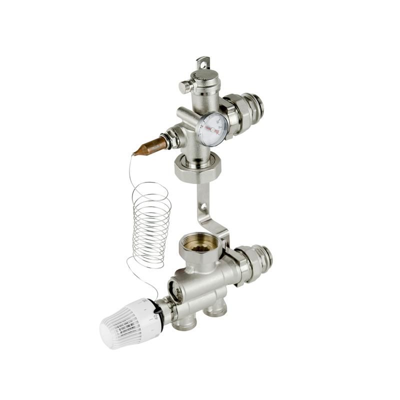 Этот узел используется в системах теплых полов для создания оптимальной температуры воды на входе в контур. Он позволяет снижать температуру горячей воды от котла до нужного уровня (обычно 35–45 C), предотвращая перегрев покрытия пола. Подходит для частных домов, квартир, коммерческих объектов с гидравлическими коллекторными группами. Применяется совместно с внешним циркуляционным насосом, термостатическими клапанами и автоматикой управления.