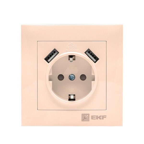 Розетка 1-местная с заземлением и защитными шторками 16А кремовая с 2 USB 2,1А от бренда EKF, серия Валенсия - это компактное решение для современных помещений, сочетающее стандартную силовую розетку с двумя USB-портами для быстрой зарядки устройств. Подходит для скрытой установки в жилых и офисных интерьерах.