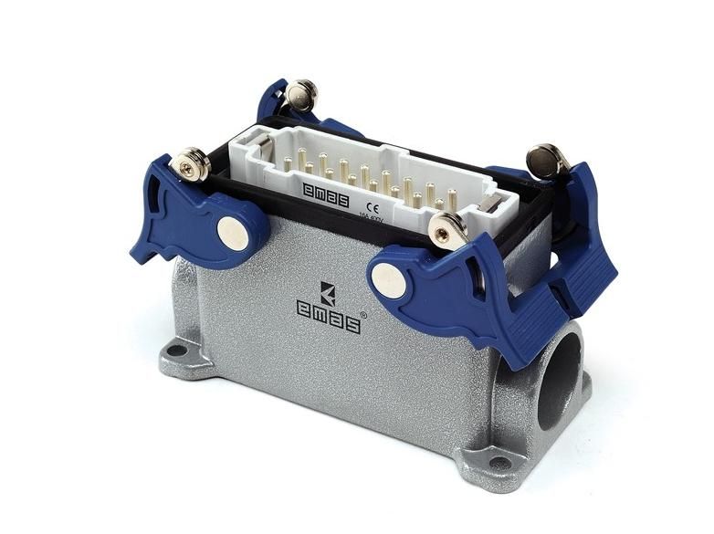 Вилка 16 полюсов 16А с 4-мя фиксаторами и 2-мя боковыми вводами от EMAS (артикул ebm16fd24) - промышленный разъём с металлическим кожухом и защитой IP65, предназначенный для надёжного подключения оборудования в сложных условиях. Устройство совмещает высокую механическую прочность, устойчивость к перегрузкам и удобную установку на панели.