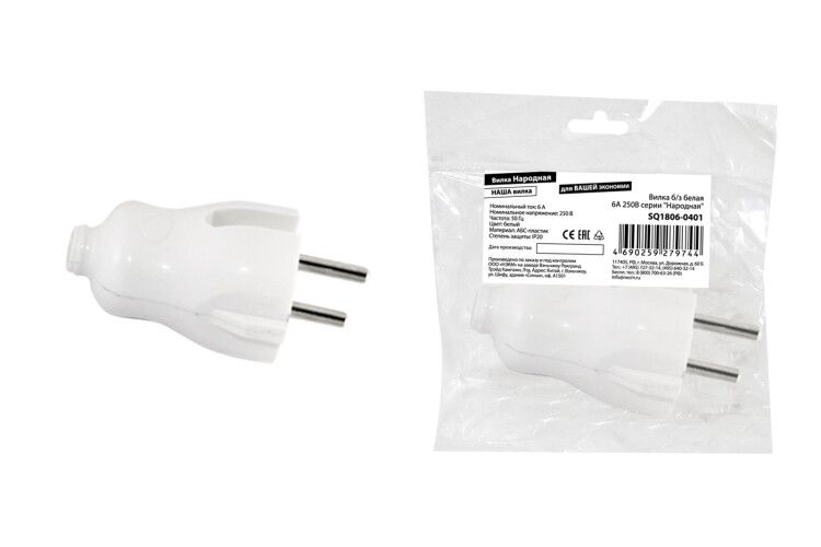 Вилка без заземления белая 6А 250В серии "Народная" - SQ1806-0401 TDM ELECTRIC подходит для использования в различных помещениях, включая жилые, коммерческие и инфраструктурные объекты. Корпус устройства выполнен из самозатухающего АБС-пластика, что обеспечивает прочность и термостойкость изделия, а также защиту от воздействия солнечных лучей.