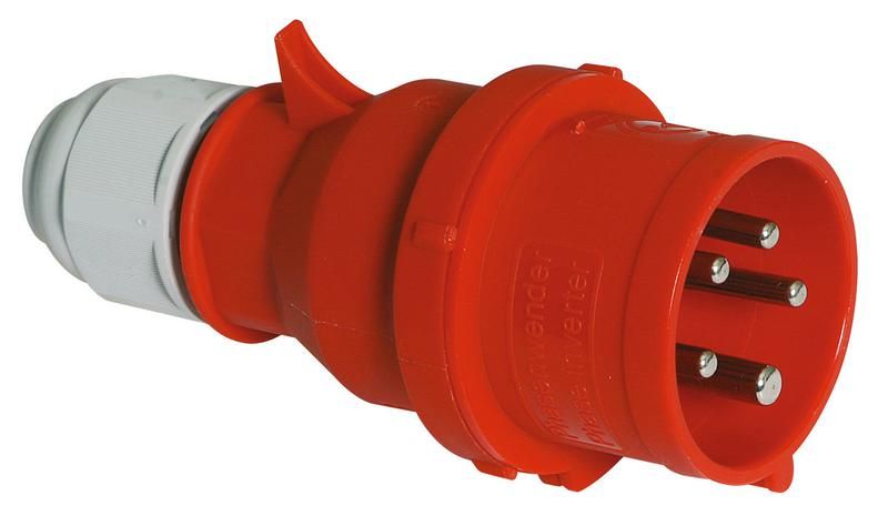Вилка соответствует требованиям ГОСТ IEC 60309-2 для промышленных разъёмов. Конструкция исключает возможность подключения под напряжением благодаря форме контактов и механизму блокировки. Красный цвет указывает на повышенную опасность - обращайтесь с устройством согласно нормам электроустановок.