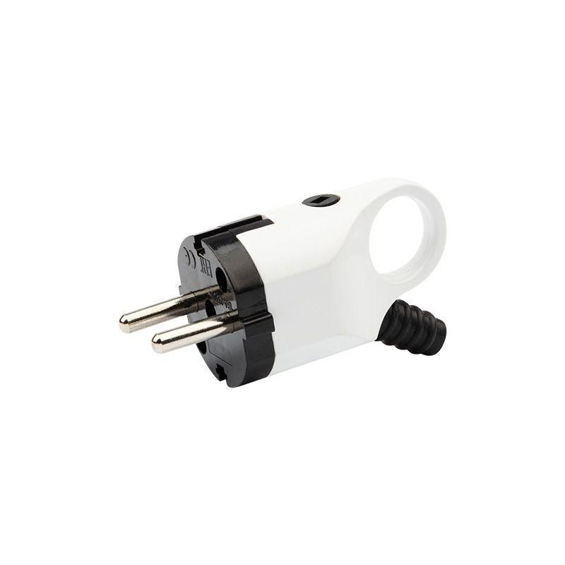 Вилка угловая 16А с защитным контактом и ушком (кольцом) бело-черная предназначена для подключения бытовой техники к сети 230 В. Подходит для ремонта электрошнуров и замены неразборных вилок, которые вышли из строя. Применяется там, где важно сохранить компактность - рядом со стенами, за мебелью или в плотных местах установки. Нельзя использовать вне помещений - степень защиты IP20 не обеспечивает защиту от влаги и пыли.
