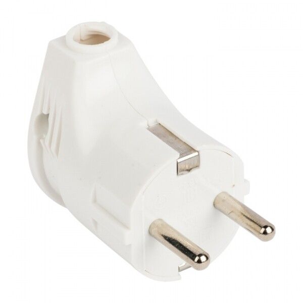 Вилка угловая с защитным контактом белая 16А 250В совместима с розетками стандарта CEE 7/7 (европейский тип с заземлением). Для монтажа используйте отвертку: ослабьте винты, вставьте зачищенный провод (до 2,5 мм2), затяните. Обязательно подсоедините зелено-жёлтый провод к контакту PE. Корпус рассчитан на установку в стандартную распределительную коробку глубиной не менее 40 мм. Не рекомендуется использовать в местах с высокой влажностью или открытых площадках - степень защиты IP20 не допускает попадание влаги.