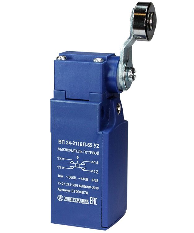 Выключатель путевой ВП 24-2116П-65 У2 от бренда Электротехник - это механический коммутационный аппарат для фиксации и контроля положения движущихся узлов в автоматизированных системах. Он работает при напряжении до 660 В, рассчитан на ток 3 А и защищён от пыли и струй воды (IP65), что делает его подходящим для промышленной эксплуатации в сложных условиях.