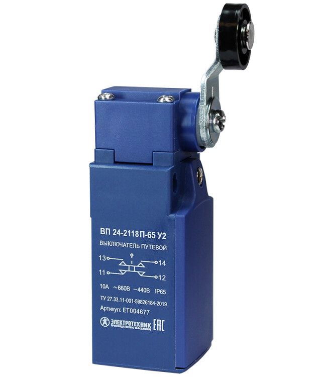 Выключатель путевой ВП 24-2118П-65 У2 от бренда Электротехник - компактное устройство для фиксации положения подвижных механизмов в автоматических системах. Он работает на основе механического воздействия, обеспечивает коммутацию цепей управления и сигнализации, и подходит для условий с пылью и влагой благодаря защите IP65.