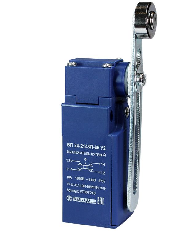 Выключатель путевой ВП 24-2143П-65 У2 от бренда Электротехник - это безинерционный концевой выключатель с регулируемым рычагом и стальным роликом, предназначенный для точного фиксирования положения подвижных узлов в автоматизированных системах. Он обеспечивает коммутацию слаботочных цепей управления при достижении заданной точки перемещения, например, на конвейерах, станках или шлюзах.