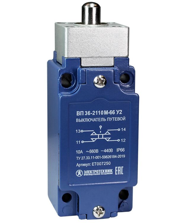Выключатель путевой ВП 36-2110М-66 У2 от бренда Электротехник - это надёжный коммутационный аппарат для фиксации положения движущихся механизмов в автоматизированных системах. Он работает в жестких условиях: защищён от пыли и воды (IP66), рассчитан на ток до 3 А и напряжение до 660 В, имеет компактную металлическую конструкцию и совместим с большинством стандартных установочных решений.