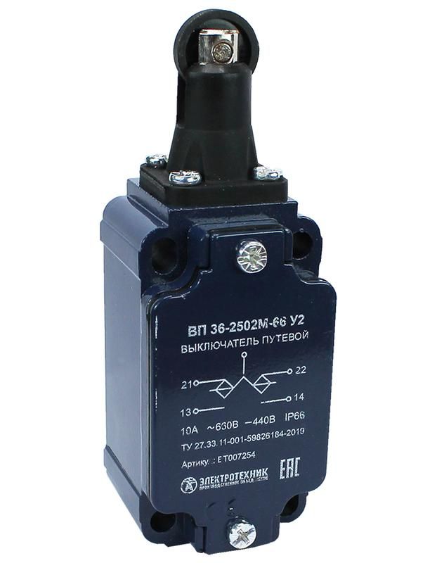 Выключатель путевой ВП 36-2502М-66 У2 от бренда Электротехник - это надёжный инерционный переключатель с толкателем на ролике, предназначенный для автоматического размыкания и замыкания цепей при достижении объектом заданной точки перемещения. Применяется в системах управления и безопасности на оборудовании с линейными или поворотными механизмами.
