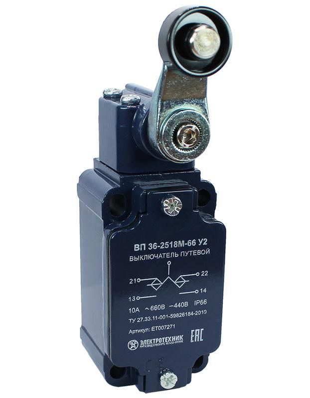 Выключатель путевой ВП 36-2518М-66 У2 1НО+1НЗ 3А IP66 рычаг с пластик. роликом инерционный 30х60мм без сальника Электротехник ET007271