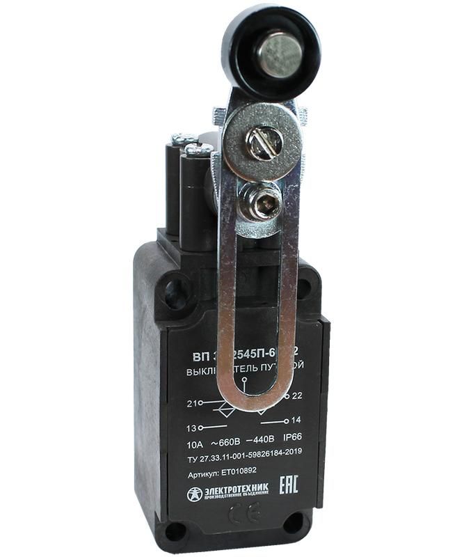 Выключатель путевой ВП 36-2545П-66 У2 от бренда Электротехник - это надёжный инерционный переключатель с регулируемым рычагом и пластиковым роликом, предназначенный для автоматического размыкания и замыкания цепей при достижении объектом заданной точки перемещения. Артикул et010892 подходит для установки на станках, конвейерах и других устройствах, где требуется точная фиксация положения.