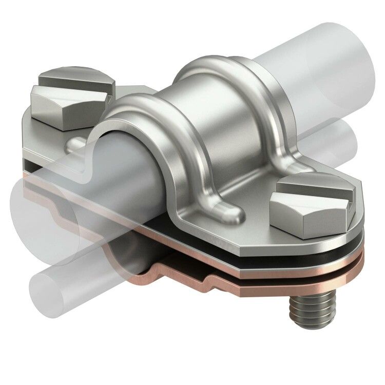 Соединитель оснащен двумя шестигранными болтами M8 x 20 из нержавеющей стали (VA), что обеспечивает прочное крепление и защиту от коррозии. Биметаллическая пластина из алюминия/меди гарантирует надежный и стабильный контакт между проводниками.
