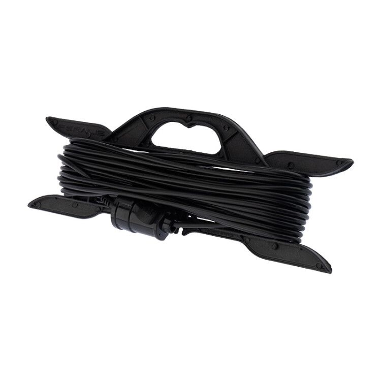 Удлинитель-шнур на рамке ПВС 2х0.75, 20 м, 6 А, 1300 Вт, IP20, черный оснащён вилкой по российскому стандарту (Schuko-совместимой, без заземляющего контакта). Розетка - однополюсная, тип C/F. Для безопасного подключения используйте только устройства с потребляемой мощностью не более 1300 Вт. Монтаж не требует инструментов: просто раскрутите рамку, вытяните нужную длину кабеля, подключите прибор. После работы намотайте кабель обратно на рамку.