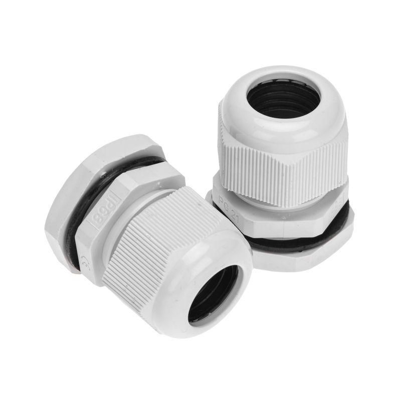Ввод кабельный PG-21 (13-18 мм) серый, комплект (2 шт) применяется для фиксации и герметизации кабелей при проходе через стенки электротехнических устройств: коммутационные шкафы, распределительные коробки, пульты управления, корпуса автоматики. Подходит для установки в условиях повышенной влажности, запылённости, на улице, в подвалах, в зонах с воздействием морского тумана или химически активных сред.