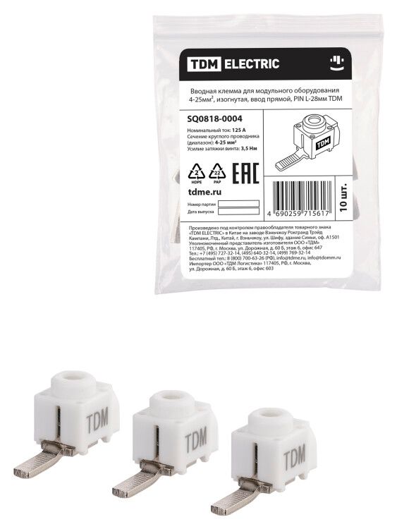 | Вводная клемма для модульного оборудования 4-25мм², изогнутая, ввод прямой, PIN L-28мм | SQ0818-0004 | TDM | 25.02.2026 | Под заказ | 134,14 ₽ | шт. | от 30 дней |
