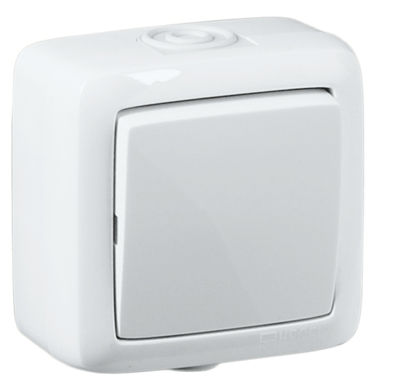 Выключатель одноклавишный наружный брызгозащищенный 10А 250В белый используется для коммутации однофазных цепей освещения. Подходит для установки там, где возможны брызги воды, запыление или перепады температур - в гаражах, на террасах, в садах, кемпингах, строительных объектах, автостоянках, подсобных помещениях и бассейнах. Устройство рассчитано на бытовую эксплуатацию, но благодаря защите IP44 может применяться и в легких промышленных условиях.