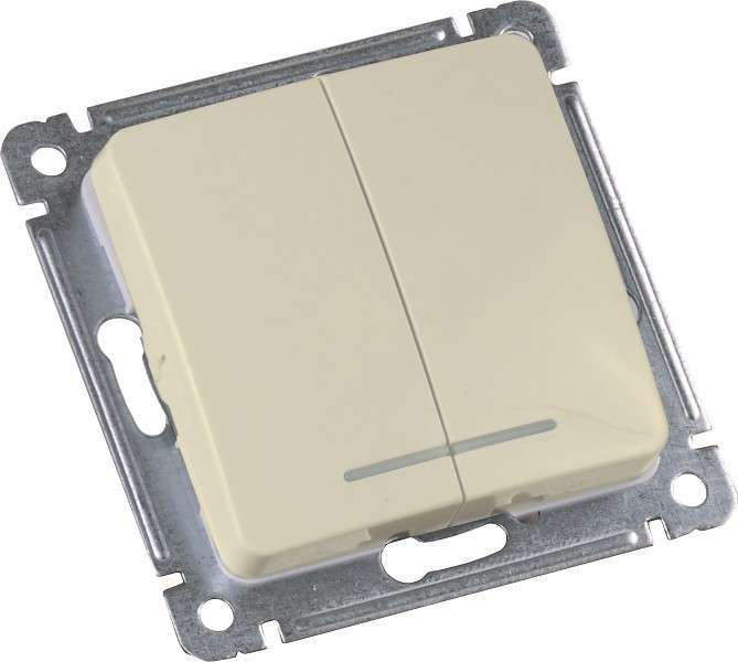 Выключатель двухклавишный 10А 250В с индикацией механизм слоновая кость используется для включения и отключения двух отдельных групп светильников - например, основного и дополнительного освещения в комнате, зонирования в гостиной или управления светом на лестнице. Подходит для установки в квартирах, офисах, медицинских учреждениях и других объектах с внутренней проводкой. Индикация особенно полезна при использовании LED- и компактных люминесцентных ламп, которые часто мерцают при выключенном положении из-за малых токов утечки в сети.