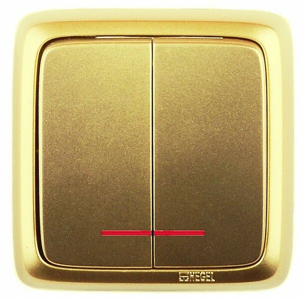 Выключатель двухклавишный наружный с изоляционной пластиной индикацией золото 10А - ВА10-154-07 HEGEL