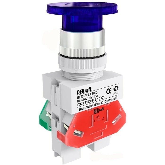 Кнопка грибовидная 22 мм синего цвета неон 220В ВК-22 от DEKraft - это кнопочный выключатель с индикацией для управления и визуального контроля электрических цепей. Подходит для монтажа на панелях оборудования, работает в сетях переменного тока и обеспечивает надежную защиту от пыли и брызг.