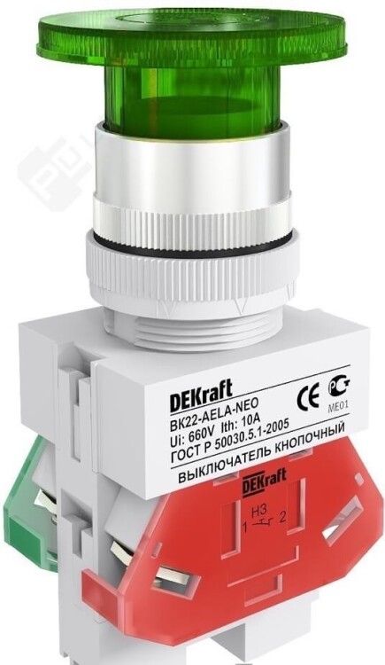 Выключатель кнопочный грибовидный диаметр 22 мм, цвет зеленый, неон, 220 В, серия ВК-22 от DEKraft - это надежный элемент управления с индикацией состояния цепи, подходящий для монтажа на панелях оборудования. Артикул 25029dek обеспечивает совместимость с типичными решениями автоматизации и контроля.
