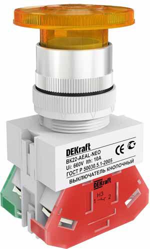 Выключатель кнопочный грибовидный диаметр 22 мм, цвет желтый, неон, 220 В, серия ВК-22 от DEKraft (арт. 25031dek) предназначен для ручного управления электрическими цепями с индикацией состояния. Подходит для установки на панелях оборудования в условиях повышенной запыленности и влаги.