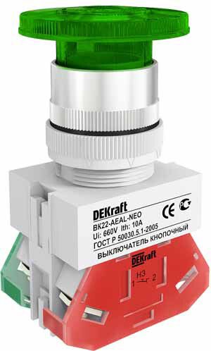 Кнопка грибовидная с фиксацией 22 мм зеленая неон 220В AEAL ВК-22 - это надёжный кнопочный выключатель с индикацией состояния цепи, предназначен для управления оборудованием в промышленной автоматизации. Бренд DEKRAFT и артикул ВК-22 указывают на серийную продукцию, соответствующую российским нормативам.