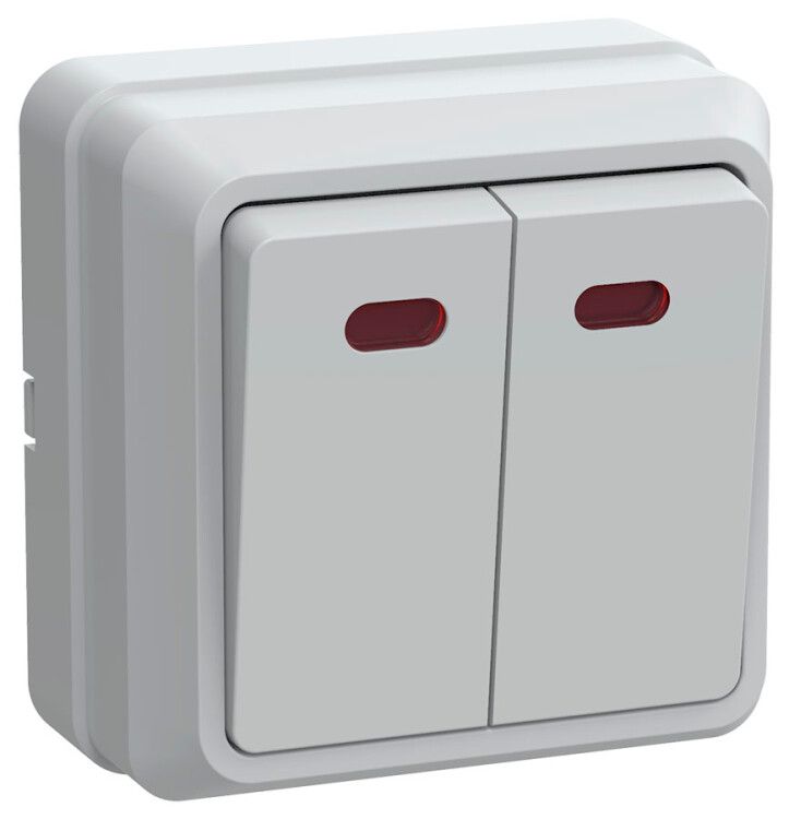 Выключатель двухклавишный наружный с индикацией 10А белый ВС20-2-1-ОБ используется для включения и отключения двух независимых электроприборов - например, двух групп освещения, вентилятора и светильника, или розеточных цепей. Подходит для установки в квартирах, офисах, школах и других помещениях с сухими условиями. Индикация позволяет легко определить, находится ли каждый из каналов во включенном состоянии, даже при плохом свете.
