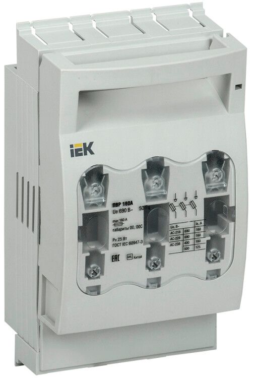 Выключатель-разъединитель-предохранитель IEK (ИЭК) артикула srp-10-3-160 - устройство для ручного отключения цепей и защиты от перегрузок и КЗ в распределительных щитах. Подходит для стационарной установки в низковольтные комплектные устройства с переменным током до 690 В.
