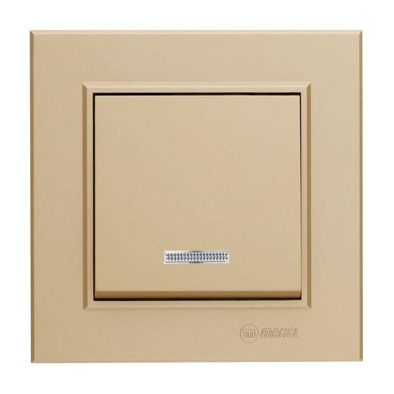 Выключатель одноклавишный с подсветкой 10А IP20 латунь СП от бренда Makel (артикул 56057021) предназначен для коммутации освещения в жилых и офисных помещениях. Ключевая особенность - латунная рамка и светодиодная подсветка клавиши, обеспечивающая удобство управления в темноте.