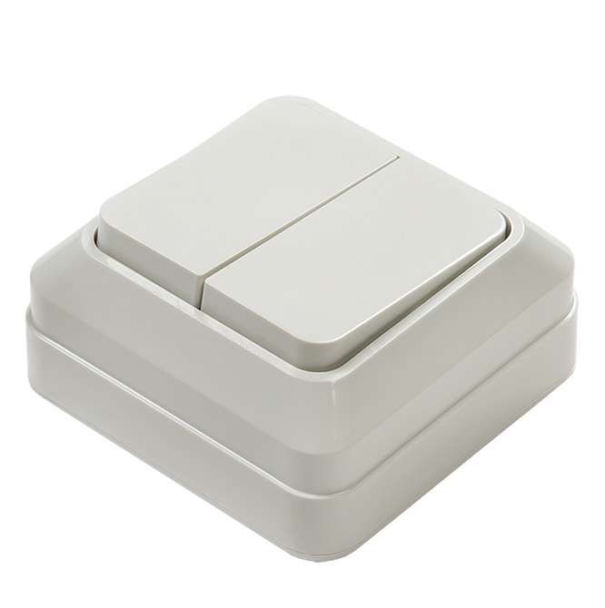 Выключатель 2-клавишный 10А IP20 белый монтируется накладным способом. В комплекте предусмотрена металлическая монтажная пластина - её необходимо закрепить на стене, после чего выключатель фиксируется на ней. Для подключения используются два входящих провода (фаза) и два выходящих к каждой группе светильников. Учитывайте, что устройство рассчитано исключительно на однопроводную схему - ноль подводится напрямую к светильникам. Диаметр отверстий под провода - стандартные 6–8 мм.