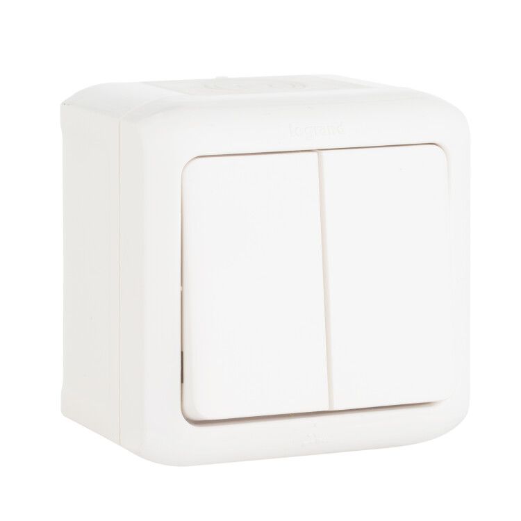 Выключатель двухклавишный наружный белый 10А IP44 250В монтируется открытым способом на стену через винтовое крепление. Совместим с наружными распределительными коробками стандарта Legrand Quteo. Для монтажа требуется предварительно подготовить отверстие под корпус и завести два одножильных или многожильных провода (до 2,5 мм2) в клеммы. Каждая клавиша управляет одной линией - важно правильно распределить фазы и нулевые проводники согласно схеме подключения. Не используйте автоматические выключатели вместо этого устройства - он не обеспечивает защиту от перегрузки или КЗ.