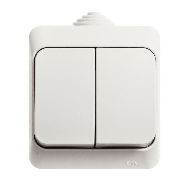 Выключатель двухклавишный наружный 10А IP44 белый предназначен для коммутации осветительных нагрузок в помещениях с высокой влажностью или риском брызг воды - например, в ванных, туалетах, на лестницах, в подъездах или хозяйственных зонах. Каждая клавиша управляет отдельным светильником или группой ламп, что позволяет экономить энергию, включая только нужную часть освещения. Подходит для работы с лампами накаливания, светодиодными, энергосберегающими и люминесцентными источниками света.
