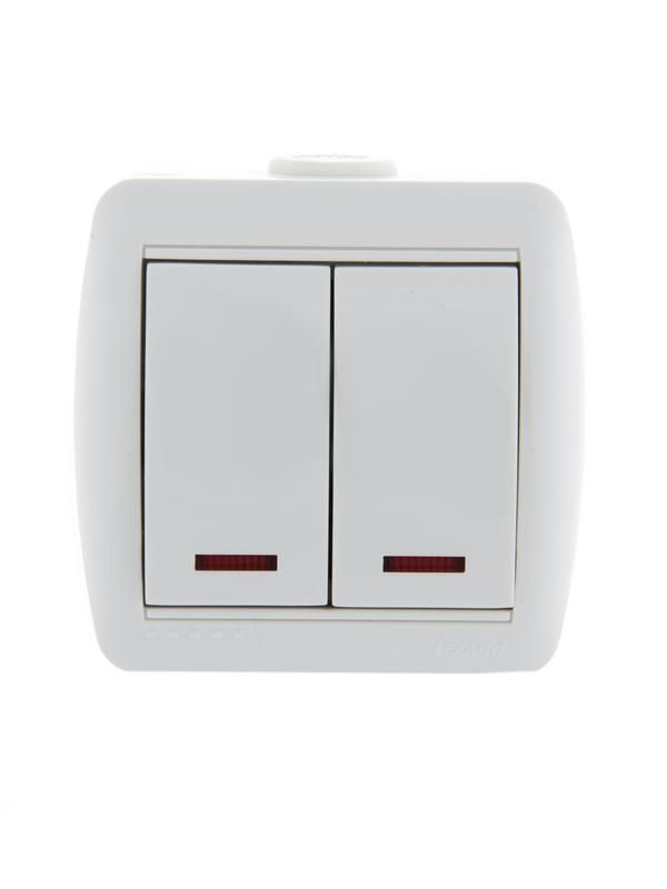 Выключатель двухклавишный с подсветкой Lezard 710-0200-112 предназначен для управления двумя группами освещения в помещениях с обычной влажностью. Благодаря встроенной подсветке и открытому монтажу, он удобен для установки в существующих интерьерах без штробления стен.
