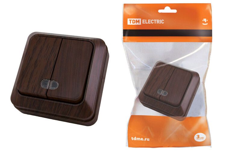 Выключатель двухклавишный открытой установки с подсветкой IP20 10А, бук ''Ладога'' - SQ1801-0030 TDM