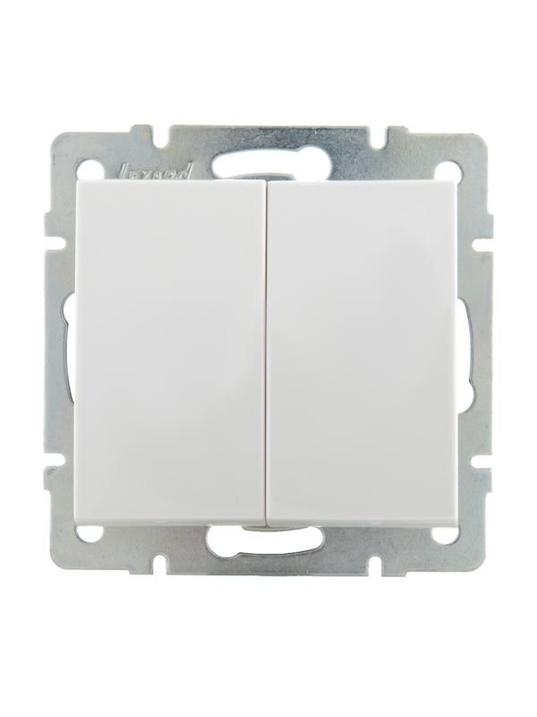 Выключатель двойной белый механизм, IP20 предназначен для включения и выключения двух независимых групп светильников или других электроприборов мощностью до 2,2 кВт. Подходит для установки в квартирах, домах, офисах и других закрытых помещениях с контролируемой средой. Не используется на улице, в сырых зонах (ванна, баня) или в местах с высокой запылённостью.