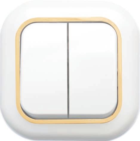 Выключатель 2-клавишный СП 6А IP20 С56-034 белый/золотой соответствует требованиям ГОСТ Р 50030.2 и ГОСТ Р МЭК 60669-1, которые регламентируют безопасность бытовых выключателей. Отключение тока происходит исключительно механически - без автоматического гашения дуги, поэтому не предназначен для частых перегрузок или коммутации мощных двигателей. Не используйте его для управления нагревательными приборами выше 1,4 кВт.