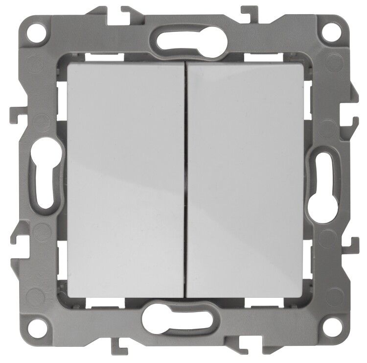 Выключатель двойной 10А 250В IP20 белый 12-1104-01 от бренда Эра - это механический выключатель с двумя клавишами для внутренней установки в подрозетники. Подходит для управления двумя группами освещения или нагрузками до 10 А. Артикул 12-1104-01 входит в серию Эра 12 и совместим с рамками этой же серии.