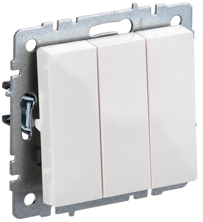 Выключатель ВС10-3-0-БрБ белый предназначен для скрытой установки в подрозетники стандарта ГОСТ. Механизм крепится двумя способами: на распорные лапки и через винты - обеспечивает плотную фиксацию даже в старых или слегка повреждённых коробках. Для монтажа требуется предварительная подготовка: вывести три фазных провода (по одному на каждую клавишу) и ноль - он не проходит через выключатель. Подключение выполняется только после отключения питания. Накладка снимается перед установкой механизма, затем фиксируется на место после окончания работ.