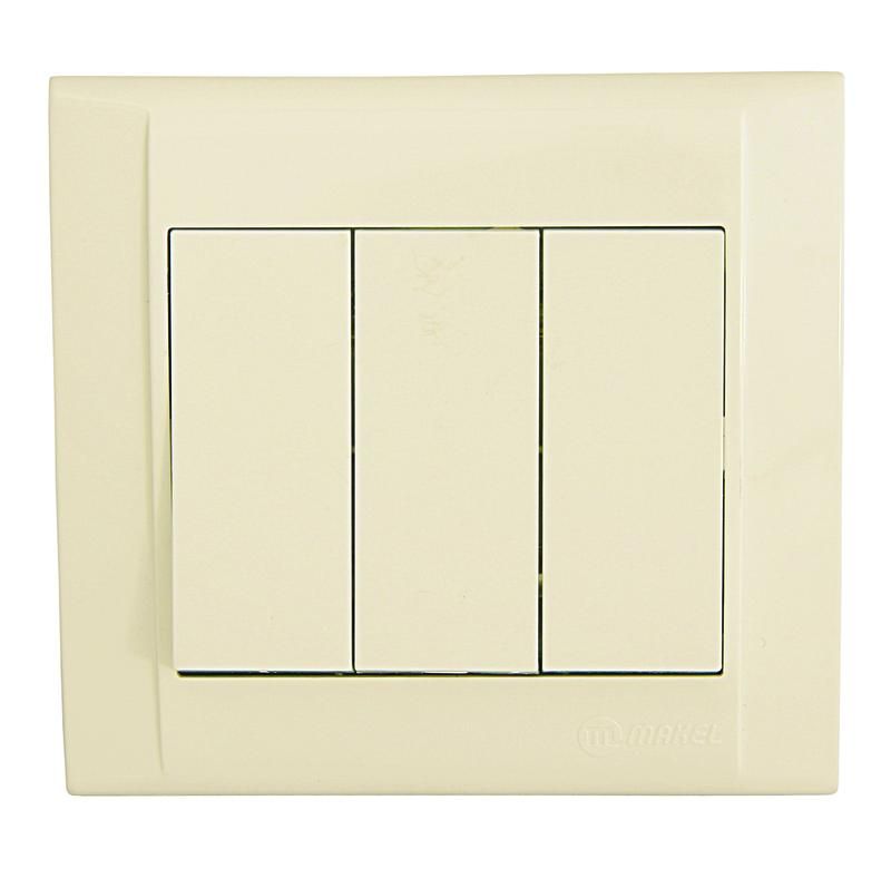 Выключатель трёхклавишный Makel Defne с артикулом 42010091 - компактное устройство для управления тремя группами освещения или нагрузок в жилых и офисных помещениях. Благодаря возвратно-нажимному механизму и защищённой конструкции IP20 он надёжно работает в условиях обычного внутреннего монтажа, сочетая функциональность и эстетичный кремово-бежевый глянцевый дизайн.