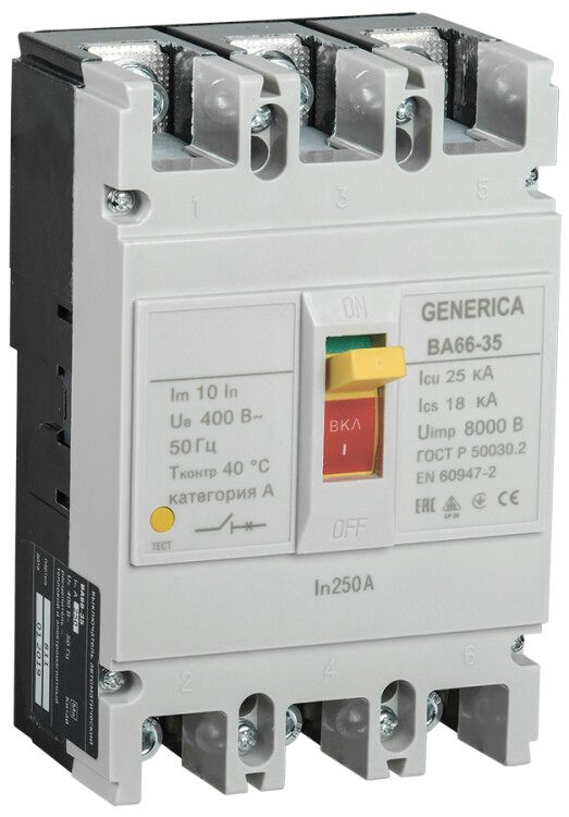 - Номинальный ток: 250 А - максимальный постоянный ток, который выключатель может проводить без повреждений;