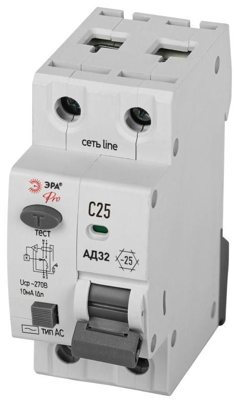 Выключатель автоматический дифференциального тока 1P+N C 25А 10мА тип AC защита 230В АВДТ 4.5кА PRO D32E2C25AC10P АД32 электронное Эра Б0057362
