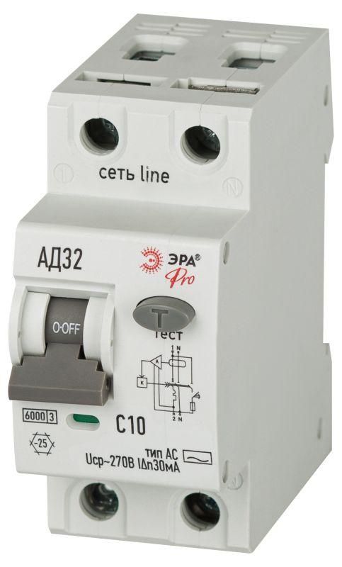 Выключатель автоматический дифференциального тока 2п (1P+N) C 10А 30мА тип AC 6кА АД-32 электрон. защита 230В PRO D326E2C10AC30P Эра Б0059110